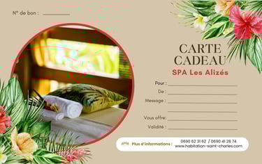 Offrez un moment inoubliable au Spa Les Alizés grâce à nos Cartes Cadeaux . Que ce soit pour un soin au Spa Les Alizés, une formule composée (avec la Table Saint Charles) ou une escapade romantique, vous offrez bien plus qu'un présent : vous offrez une expérience!