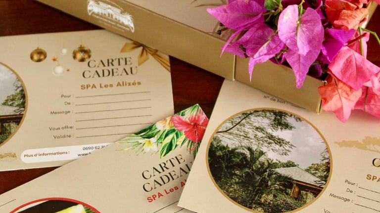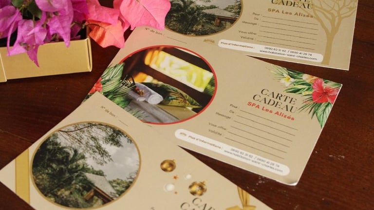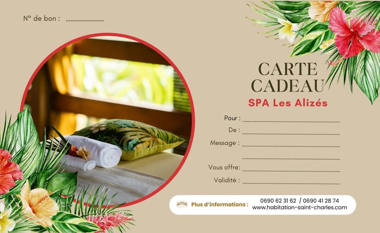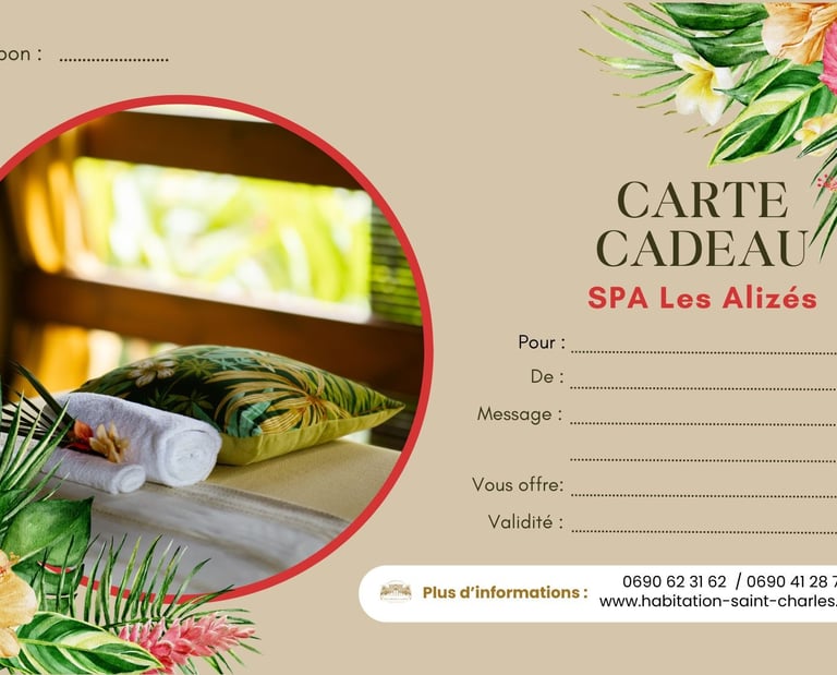 Offrez un moment inoubliable au Spa Les Alizés grâce à nos Cartes Cadeaux . Que ce soit pour un soin au Spa Les Alizés, une formule composée (avec la Table Saint Charles) ou une escapade romantique, vous offrez bien plus qu'un présent : vous offrez une expérience!